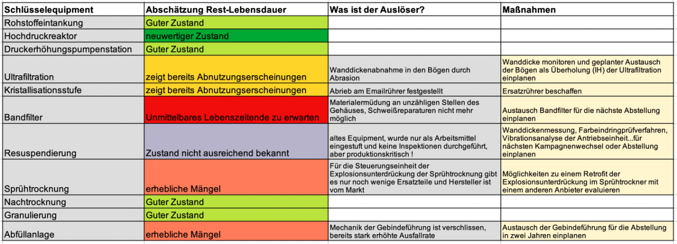 - bei der ASB stößt man erfahrungsgemäß auch auf Anlagenteile, für die keine wiederkehrenden Prüfungen durchgeführt werden und der Zustand nicht bekannt ist, z.B. bei Einstufung als Arbeitsmittel - aber trotzdem hohe Produktionskritikalität besteht!